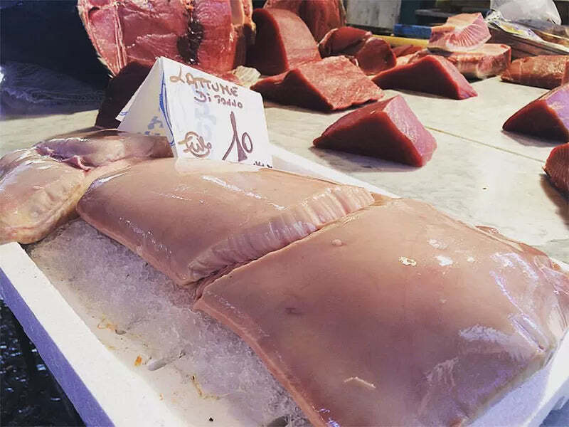 Questa è la versione ittica del lardo di maiale: si può preparare con la seppia o con il pesce spada, di cui si usa la pancia e il suo grasso, che viene salata ed essiccata e si trasforma in un salume prelibato e delicato: infatti, il pesce ha un basso contenuto di sostanze grasse sature ed è ottimo come alternativa leggera al lardo di suino.
